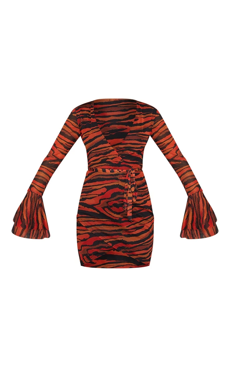 Add a fierce feel to your outfit with this bodycon dress. Featuring an orange zebra mesh material with flared sleeves, tie waist detailing and a bodycon fit. Style this with strappy heels and a shoulder bag to complete the look.