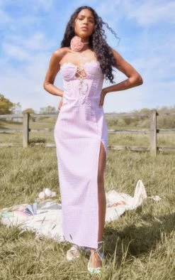 This pastel pink gingham lace trim corset split midi dress is at the top of our new season hit list. Brought to you in a pastel pink material in a gingham design for a feminine look you won’t be able to resist. With a lace trim detail and a midi length, you will be showing off your figure in all the right places. Style with some platform sandals and some statement accessories to finish off this effortlessly chic look.