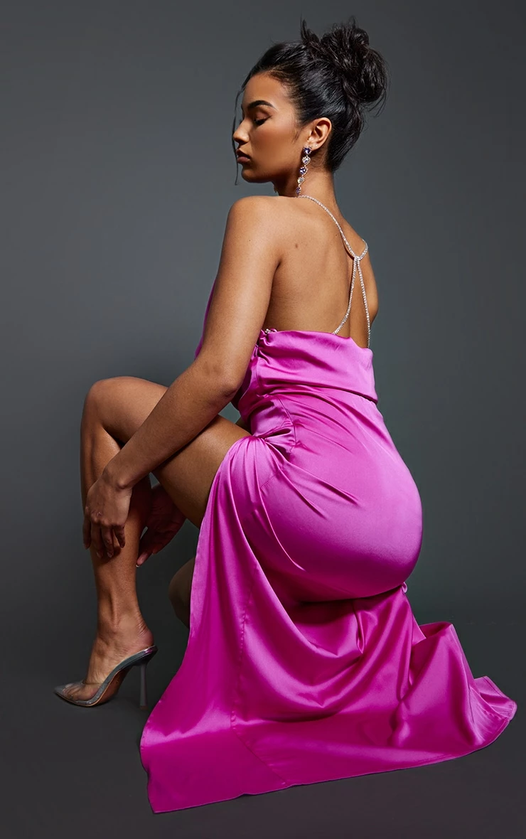 Add a little edge to your weekend wardrobe with this dress. Featuring a pink diamante material with a cross-back design and a maxi length. Style this with some clear heels and simple accessories for a look that will get you noticed.