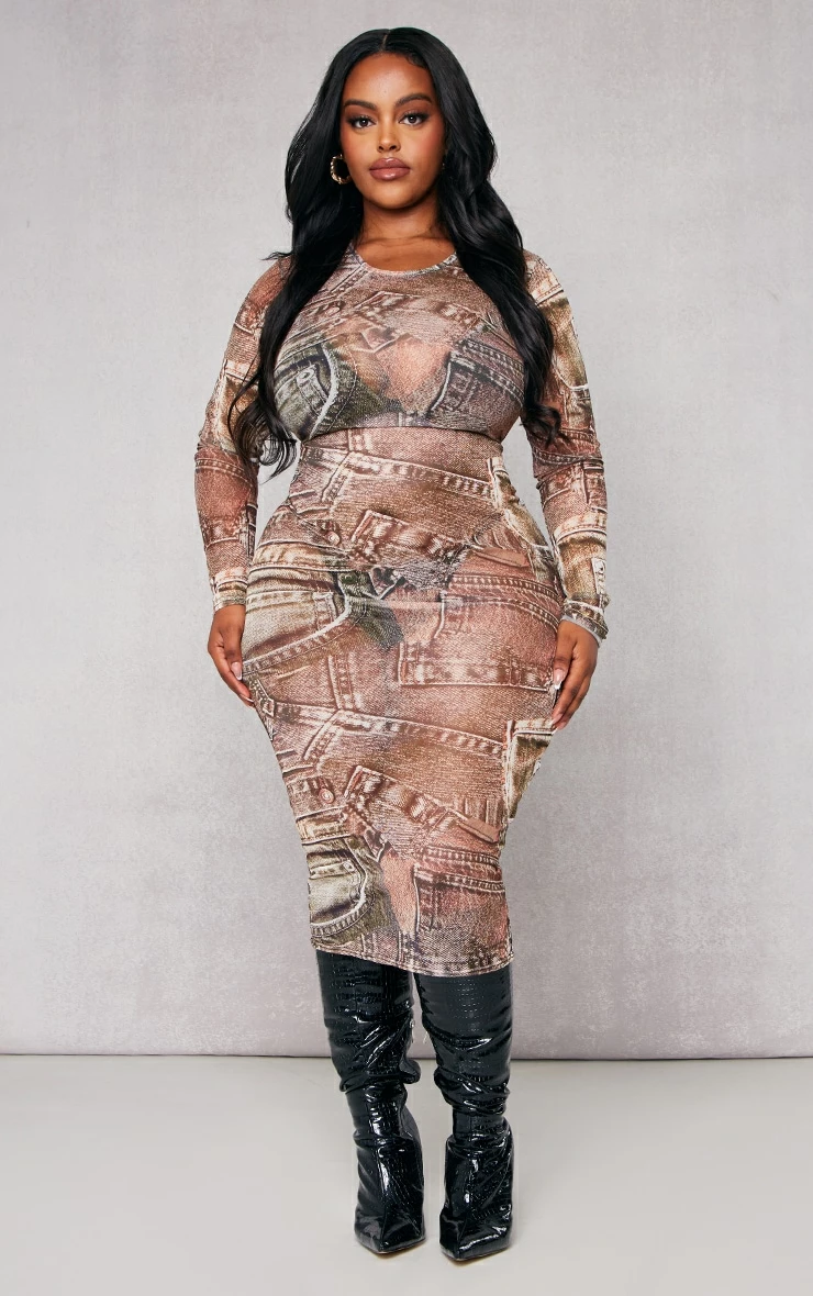 Earn some extra styling points with this midi dress. Featuring a beige mesh material with a denim print, long sleeves and a figure-worshipping fit, we are in love. Wear with knee-high boots, accessories and a bag to bring the whole look together.