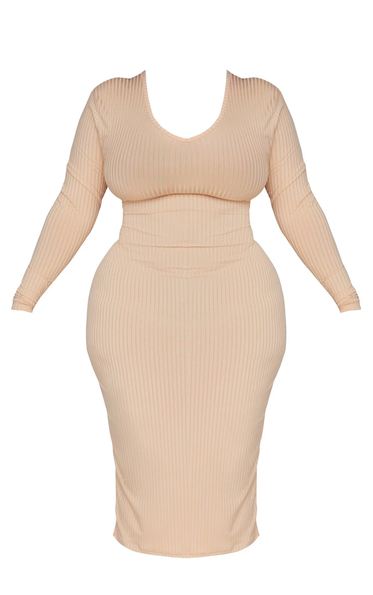 Make everyday styling simple with this midi dress. Featuring a beige rib material with a scoop neck design, long sleeves and a flattering fit, we are in love. Just add a trench coat and chunky boots for a fool proof finish.