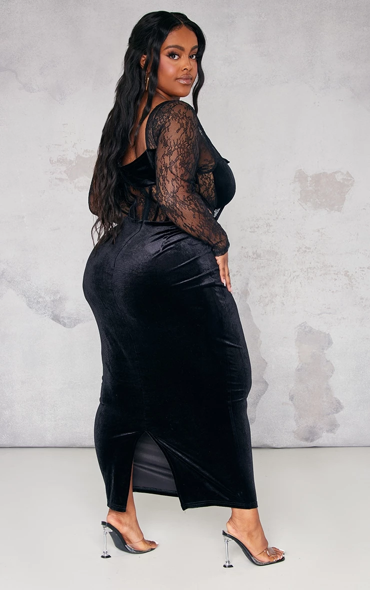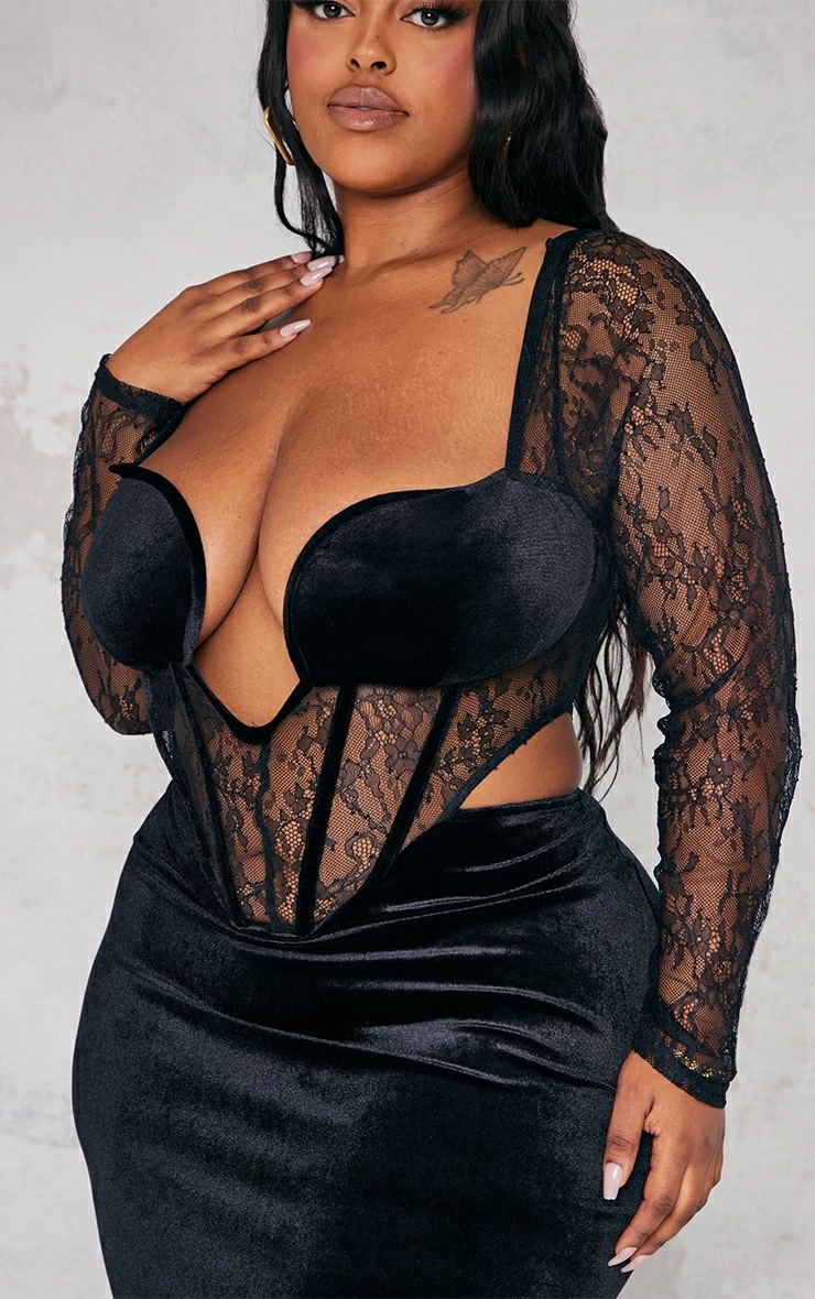 Your special occasion look is finally found with this dress doll. Featuring a black velvet material with a lace detail corset and a midaxi length, we’re obsessed. Wear with your clear high heels and accessories to glam up the vibe.