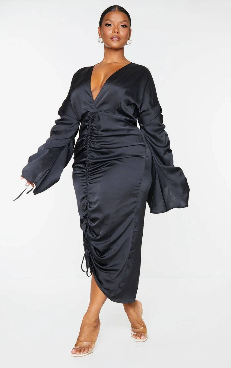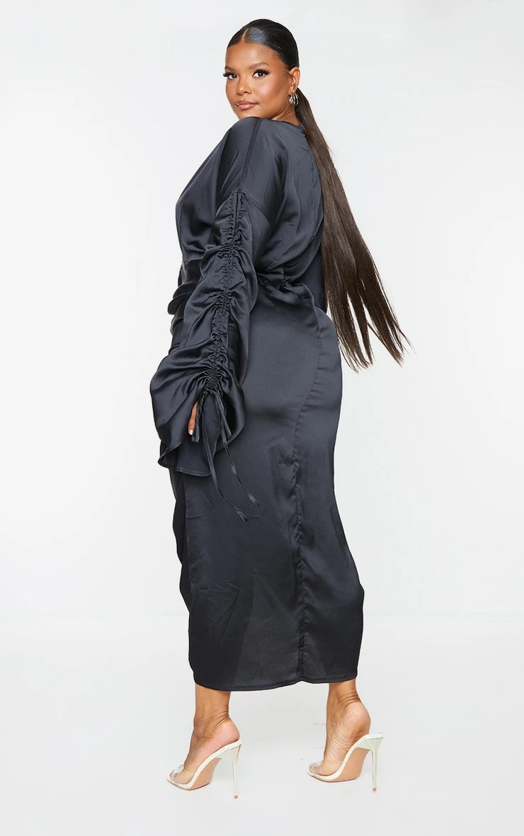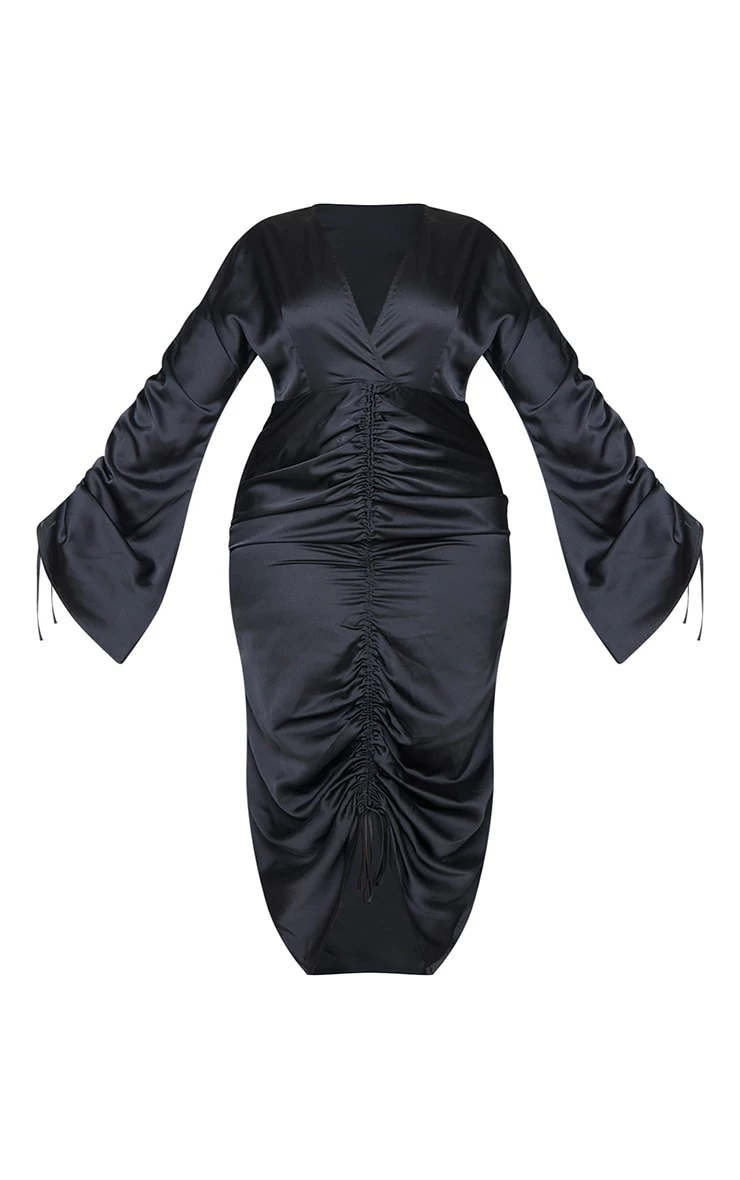Get ready to steal all the stares in this dress doll. Featuring a black satin material with a ruched design and a plunge neckline. Style with clear strap heels and your fave accessories for a dreamy date night look.