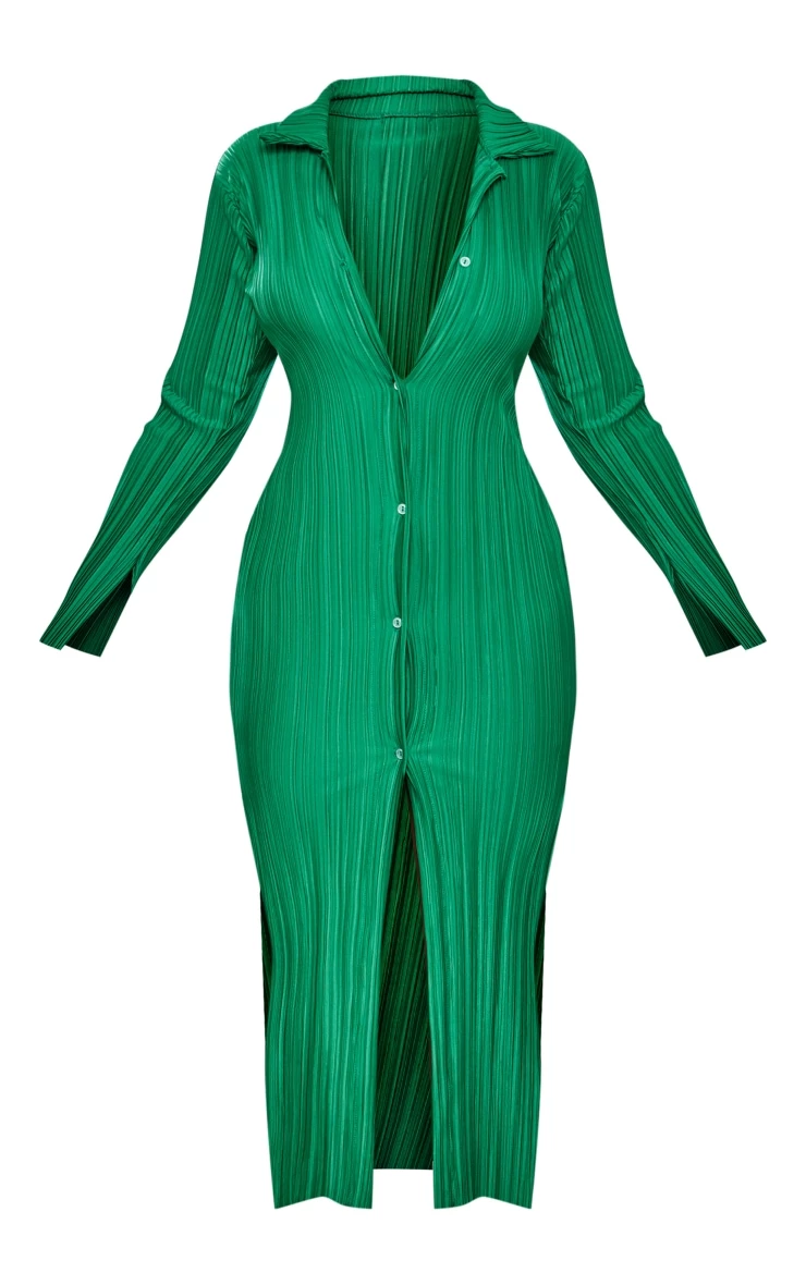 Keep your look bold and bright with this dress. Featuring a bright green plisse material with an oversized fit and a midi length. Style with tie-up heels and a clutch bag for a night with the dolls.