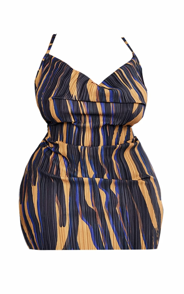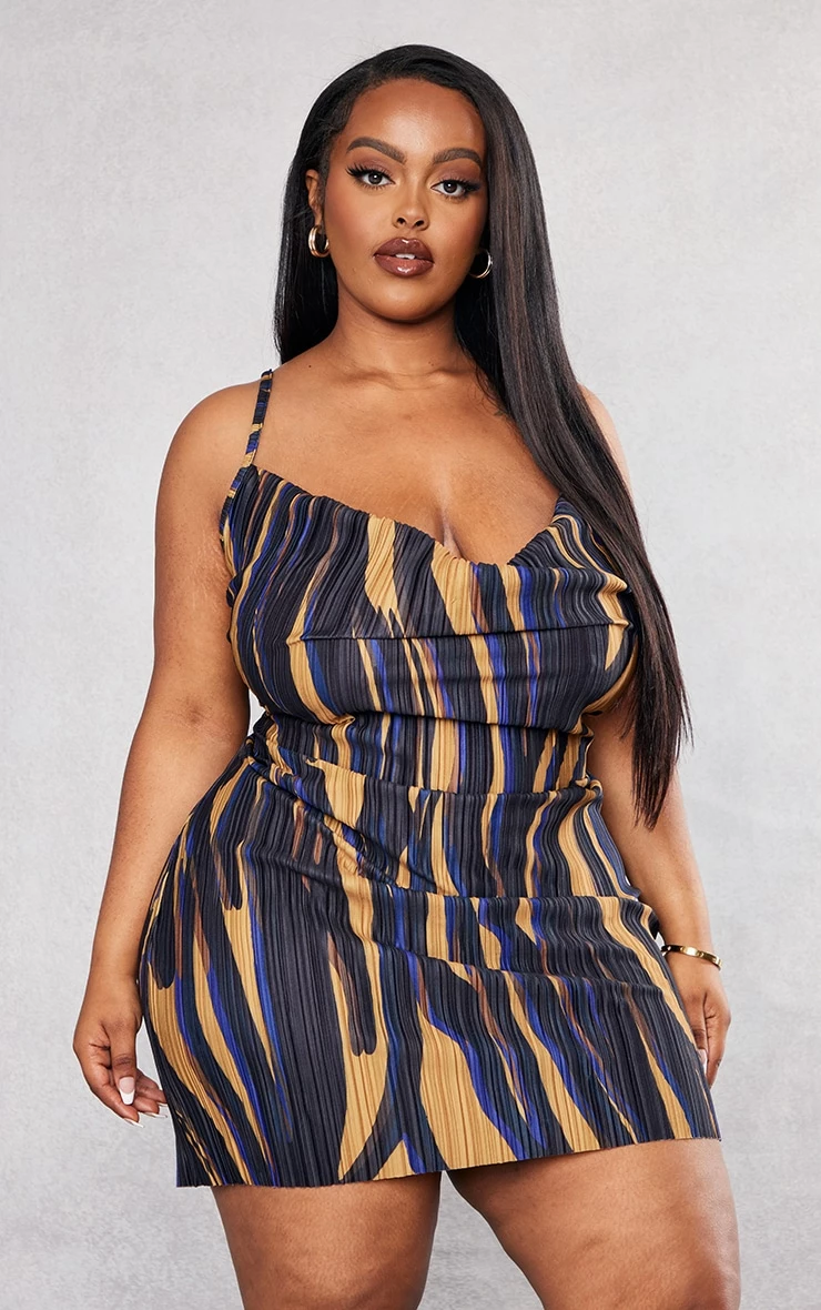 Get ready to have heads turning for all the right reasons in this statement plus brown zebra printed plisse cowl neck bodycon dress, we’re seriously obsessed. This dress is made from a brown zebra print plisse material with a cowl neck design and thin straps, what’s not to love? This plus figure-worshipping dress is sure to show off your fierce side doll. Pair with tie-up heels, an oversized blazer and a mini bag for a look that brings all the drama.