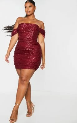 Plus Burgundy Sequin Bardot Bodycon Dress
