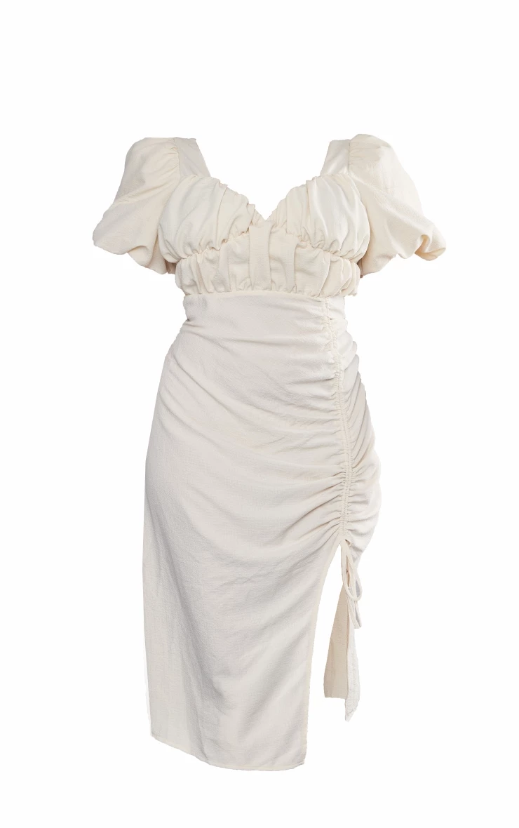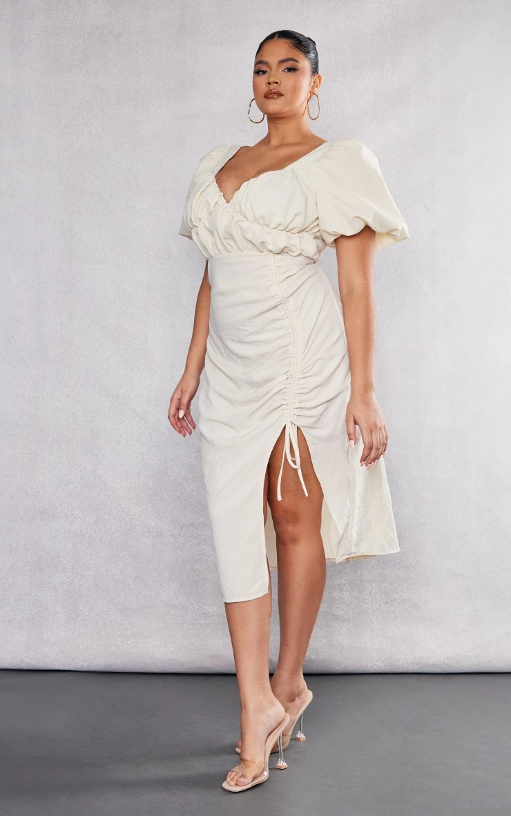 Got a special occasion in the diary doll? Then this plus cream puff sleeve ruched side split midi dress is the perfect piece for your plans. Its cream hue material is super dreamy whilst its puff sleeves and ruched detailing add a luxe touch. This plus midi dress has a side split hem and a figure-flattering fit which is sure to turn heads for all the right reasons. Pair with clear heels, gold hoops and a mini bag for a glam finish that everyone will love.
