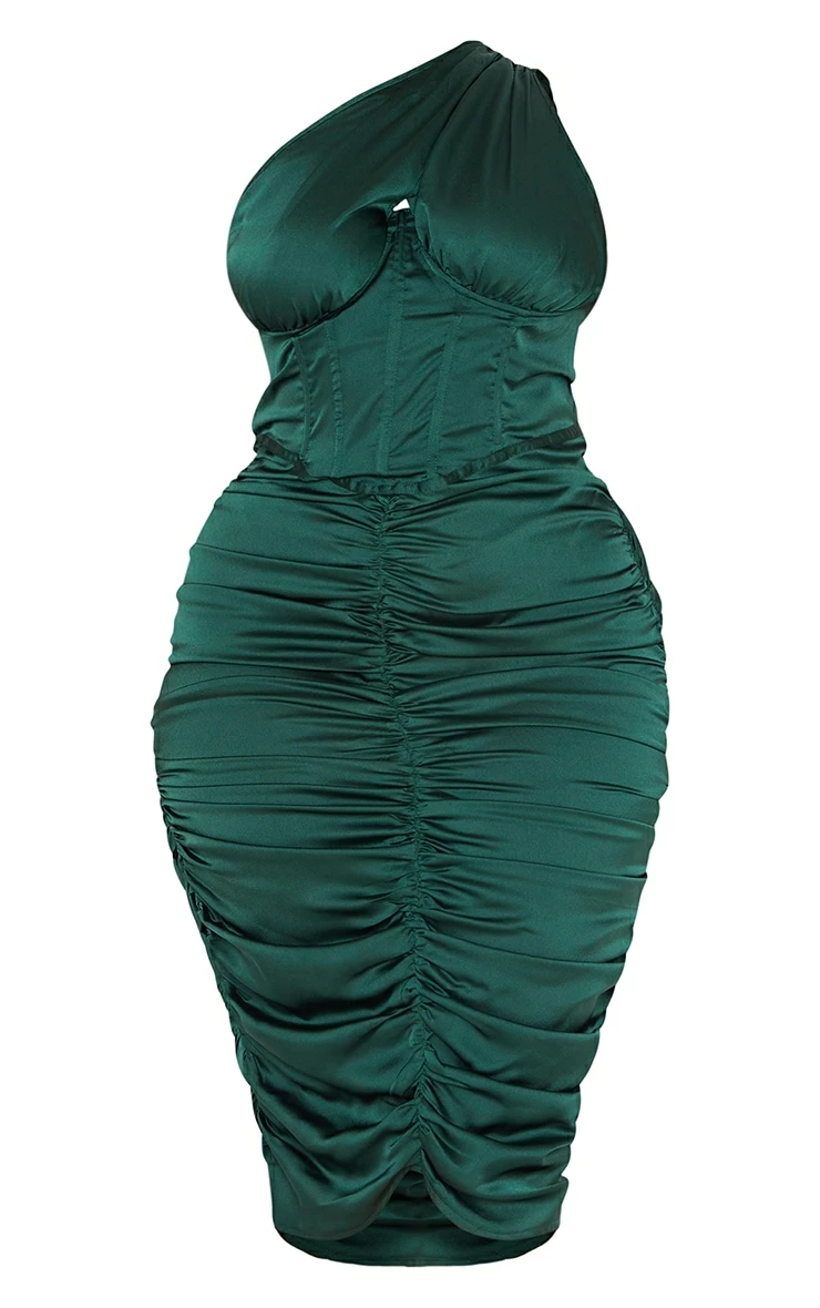 Add this luxe dress to your weekend wardrobe. Featuring an emerald green satin material with a one shoulder design, ruched detailing and a figure-skimming fit. Take the look to the next level with barely-there heels and gold accessories.