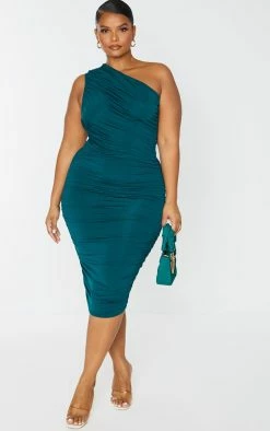 A midi dress is essential this season and we are loving this style. Featuring an emerald green slinky material with ruched detailing and a one shoulder design. Just add slip-on heels and a mini bag for a look that is sure to have all eyes on you.