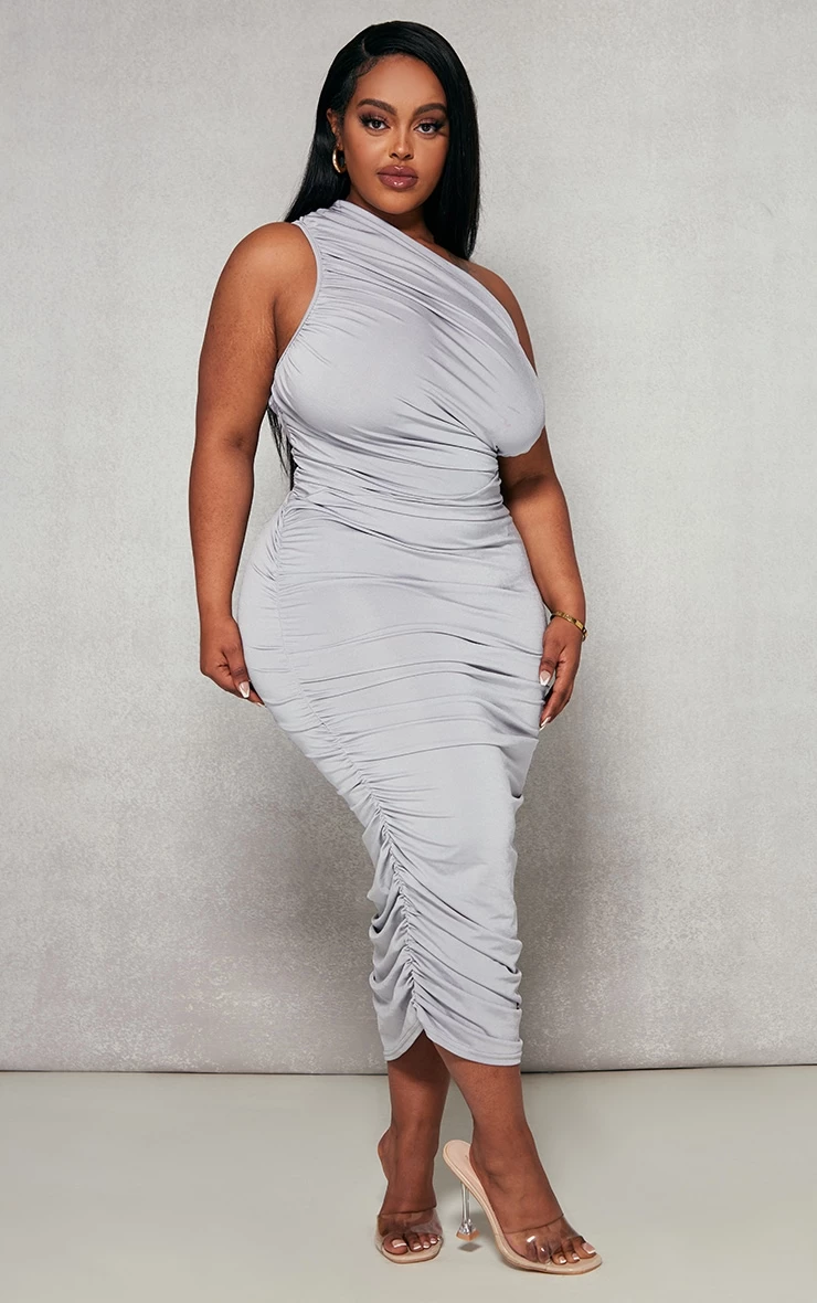 Got a special occasion pencilled into your diary doll? Then this plus grey slinky ruched one shoulder longline midi dress is sure to be at the top of your wish list. It features a grey slinky material with ruched detailing and a one shoulder design. You’re sure to have heads turning for all the right reasons doll. Style this plus midi dress with clear strappy heels and a mini bag for the ultimate glam finish.