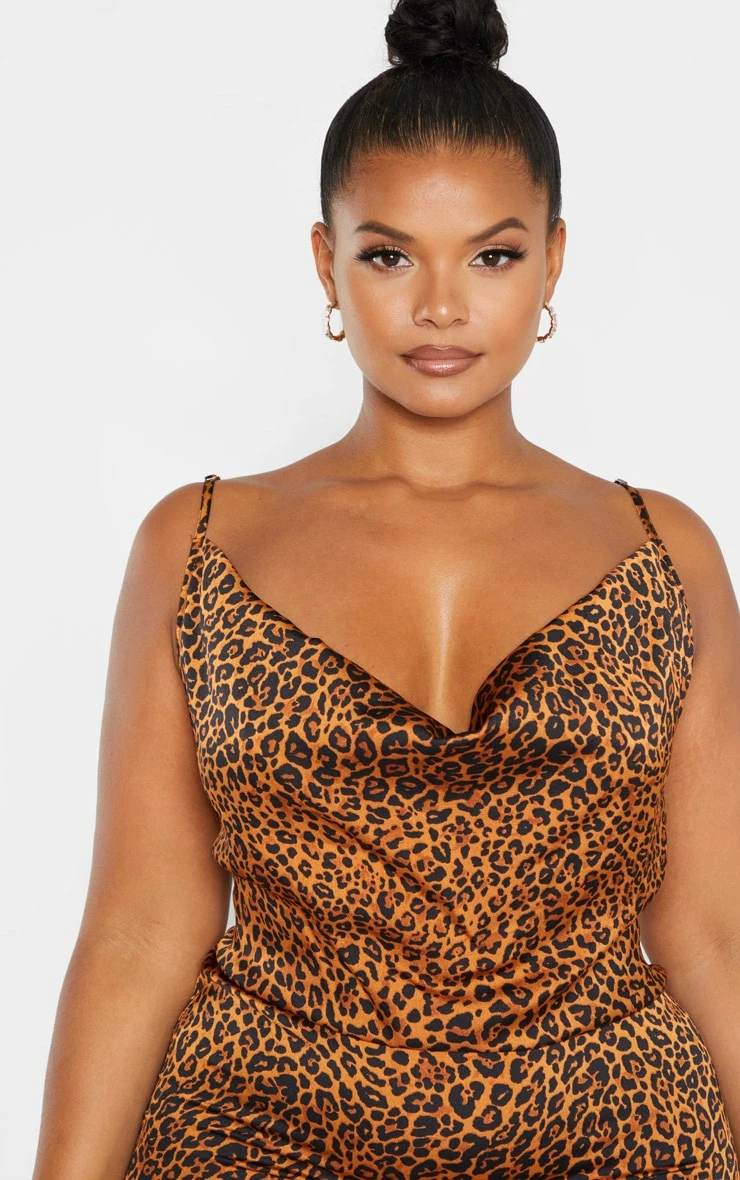 Add a fierce edge to your night out look with this must-have midi dress. Featuring a leopard print satin material, strappy detailing and a cowl neckline, team this with strappy heels for a killer look.