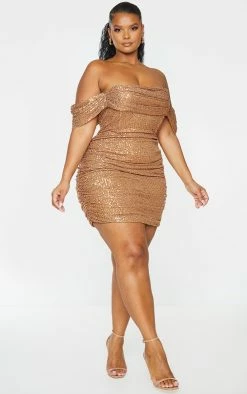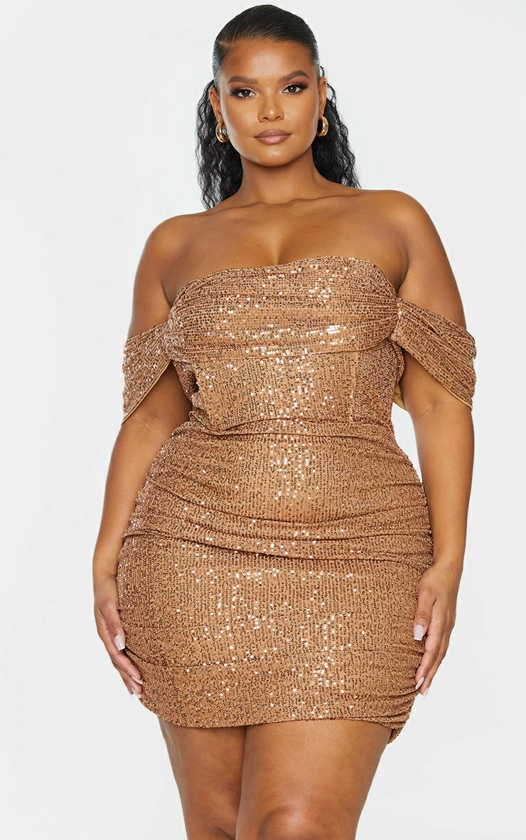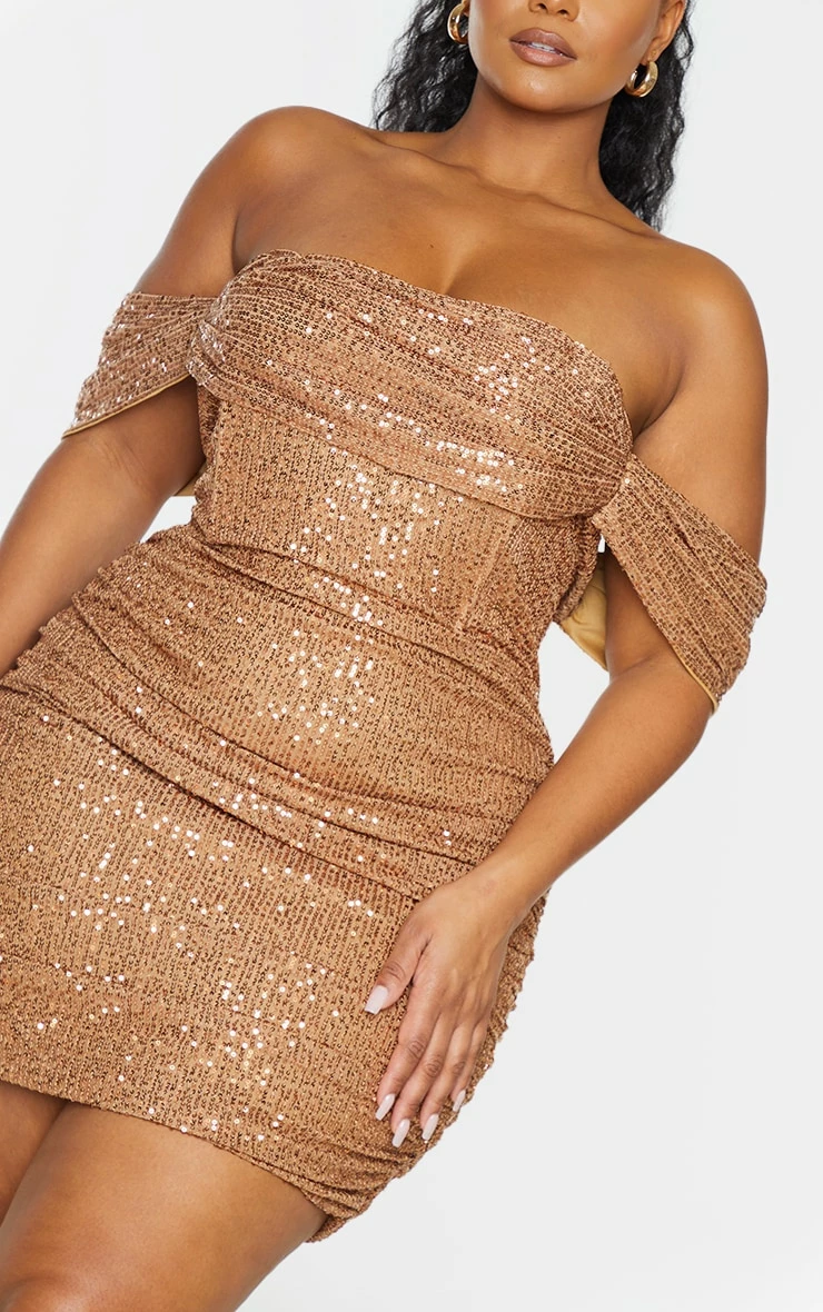 Prepare to steal the stares in this unreal figure-hugging dress doll. Featuring a gold sequin material with a bardot neckline and ruched detailing, we are in love. Wear with strappy heels and gold accessories for a serious luxe finish.