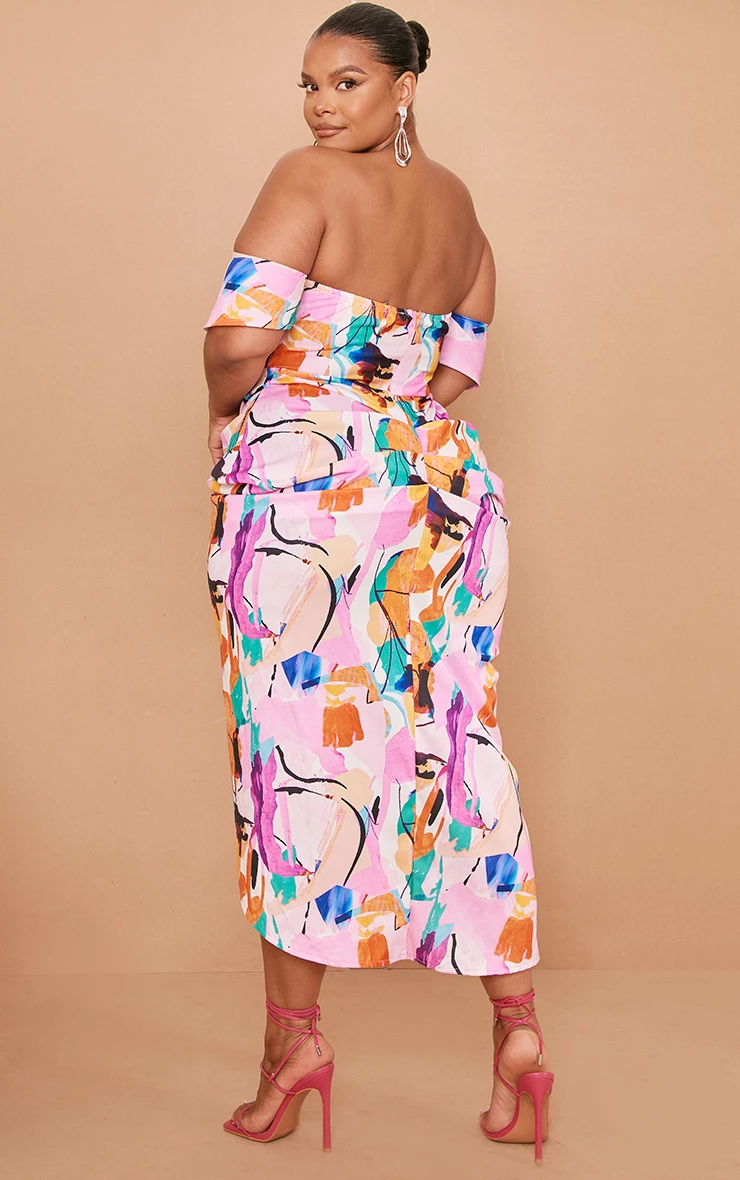 Get ready for that upcoming occasion with this dress. Featuring a multi hue material with a bardot neckline, ruched detailing and a figure-skimming fit. Style this with strappy heels and a shoulder bag to complete the look.