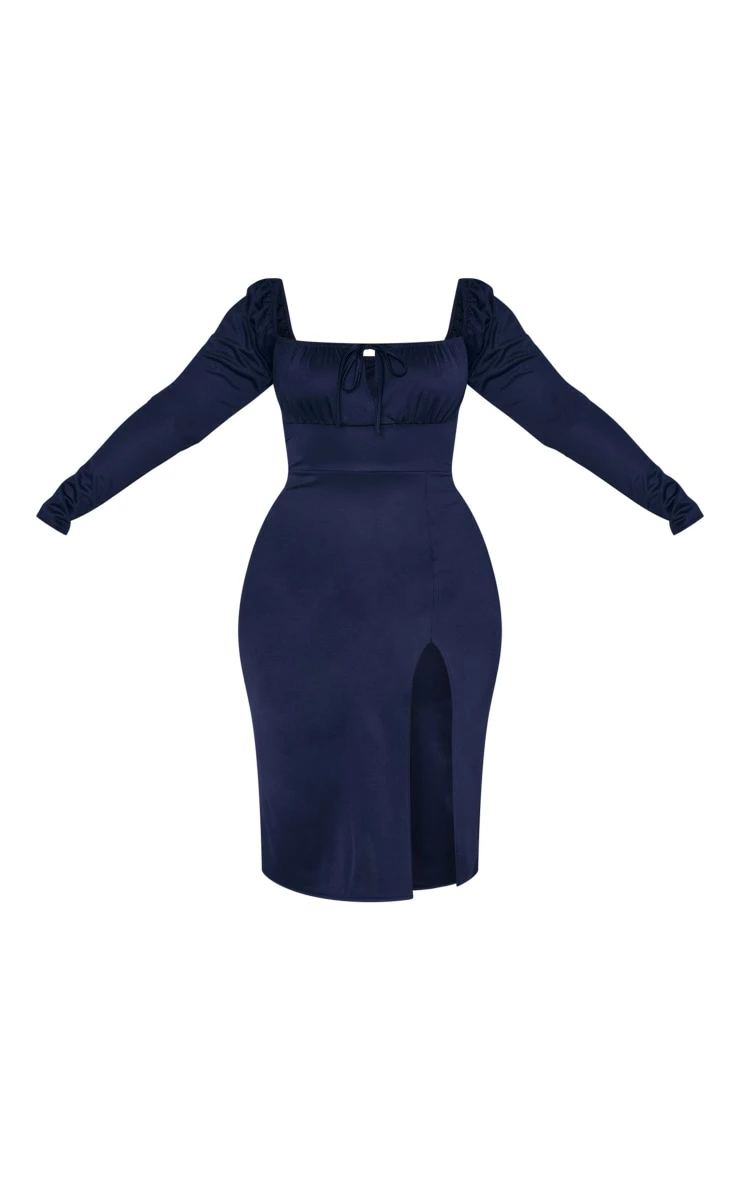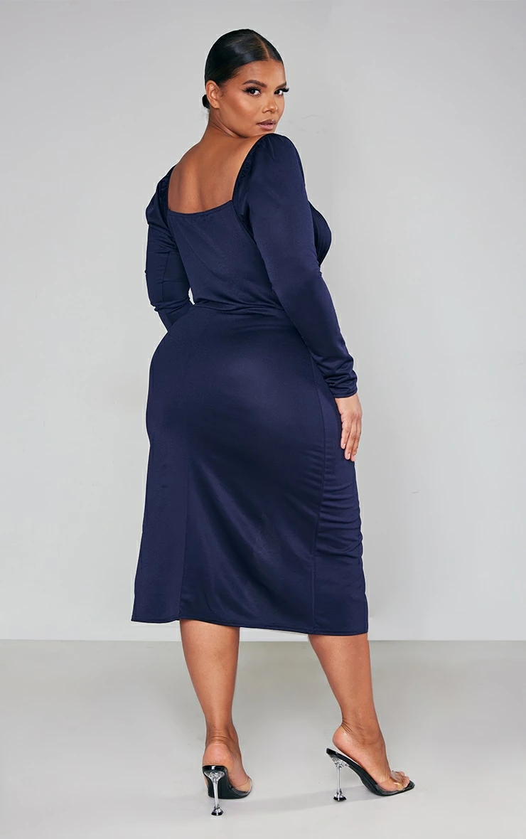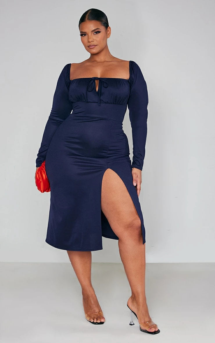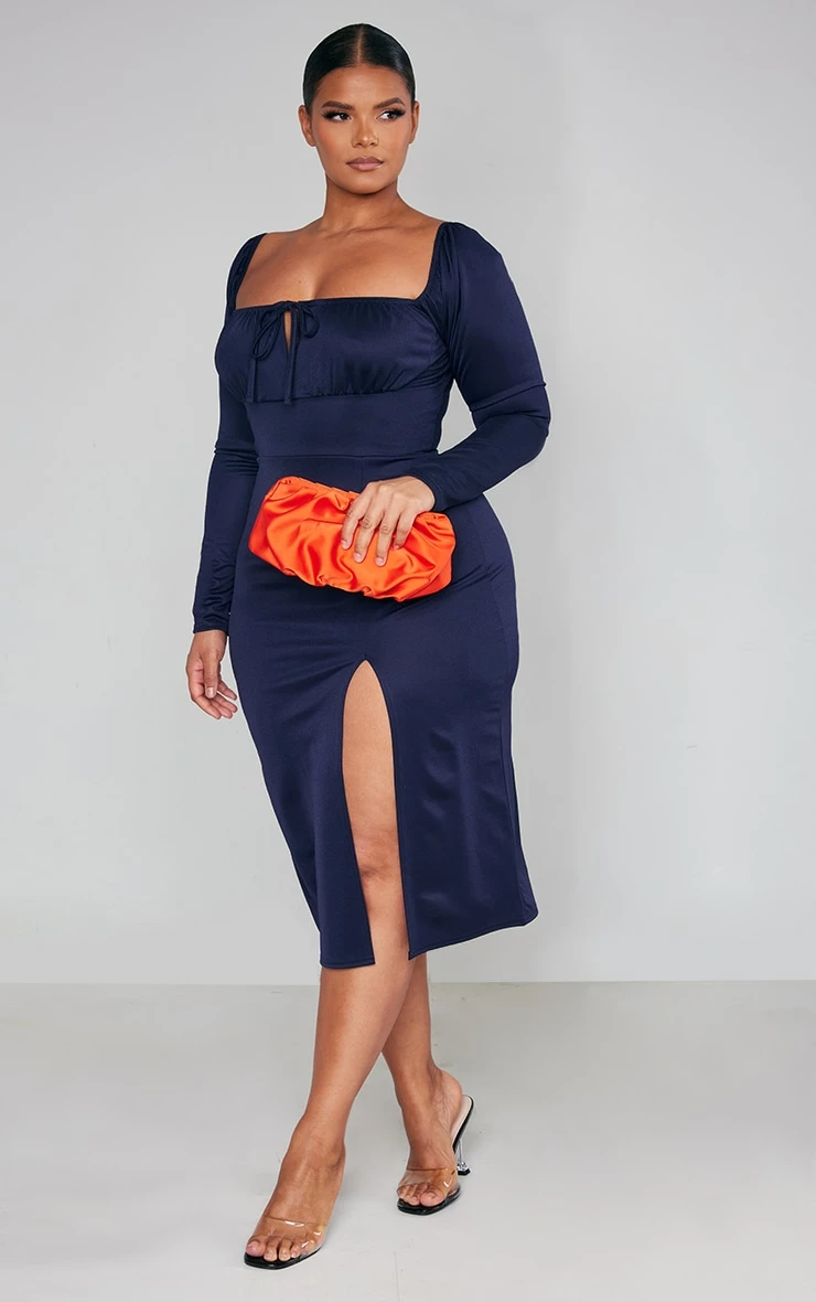 Steal the show in this dreamy dress. Featuring a navy material with puff sleeves, a tie front and midi length, what’s not to love? Wear with your clear high heels and a red clutch bag for a combo we can’t stop crushing on.