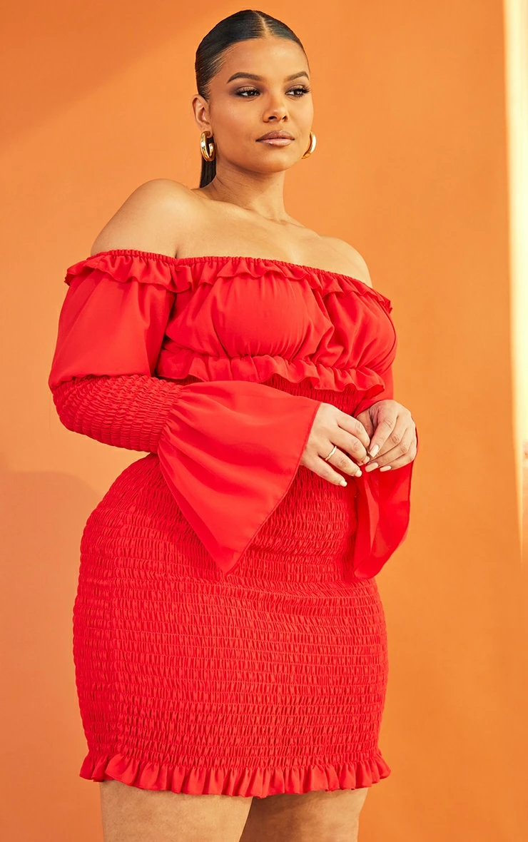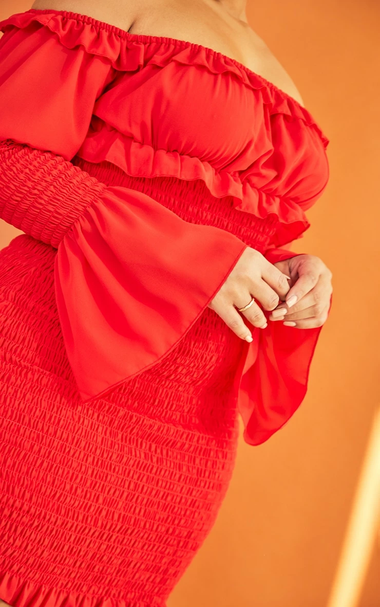 Look fierce in red with this unreal bodycon dress doll. Featuring a red chiffon material with shirred detailing and an off the shoulder design, we’re obsessed. Just add gold hoops and clear heels for a look that is sure to get you noticed.
