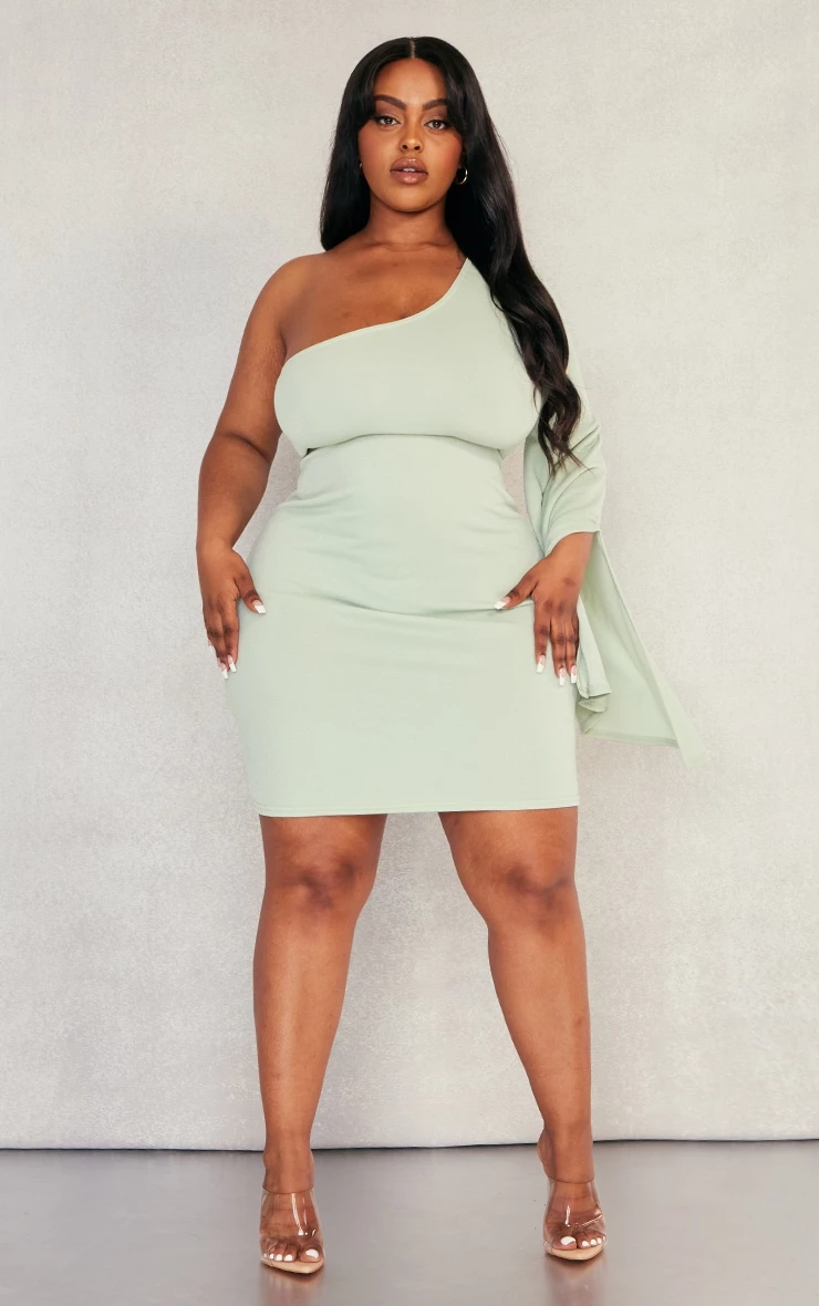 This plus sage green crepe one shoulder bodycon dress is at the top of out new season wish list. With a sage green material and a one shoulder design, this dress is a must have this season doll. This dress has a bodycon fit that will have you feeling fiercely feminine all season. Team with some clear heels and you fave gold hoops to complete the look.