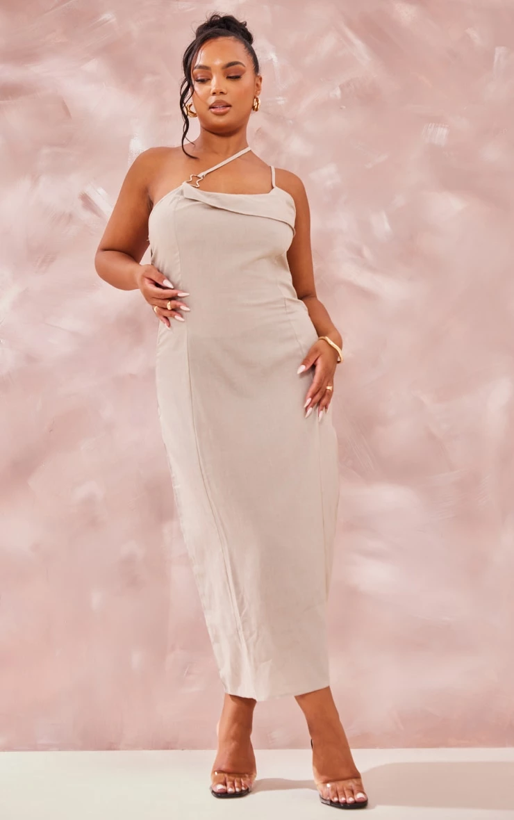 Searching for a chic weekend ‘fit has never been easier with this plus stone linen look asymmetric strap midi dress. Made from a stone hue linen look material with an asymmetric strap design and a flattering midi fit, what more could you ask for? Style this plus midi dress with clear strap heels and glam accessories for a look that is sure to steal all the stares doll.
