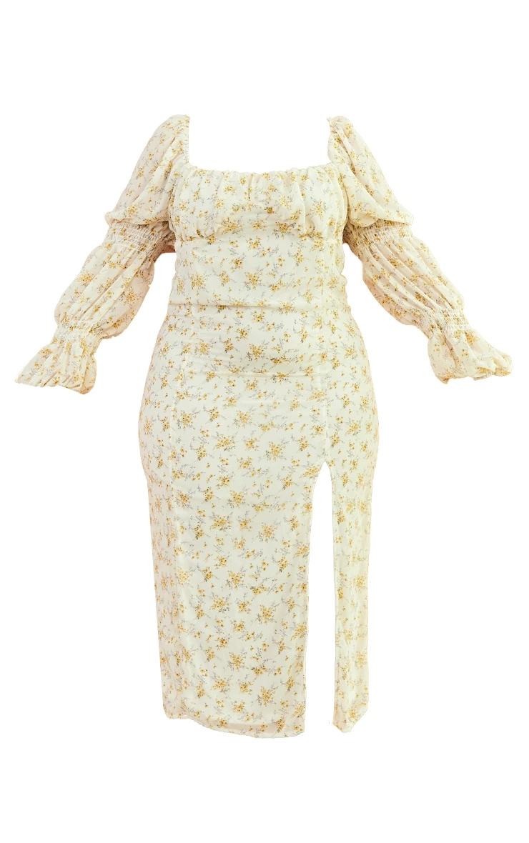 We are loving this dress for your new season wardrobe doll. Featuring a yellow material with a floral print design, long puff sleeves and a midi length. Just add heels and statement accessories for a look that will turn heads.