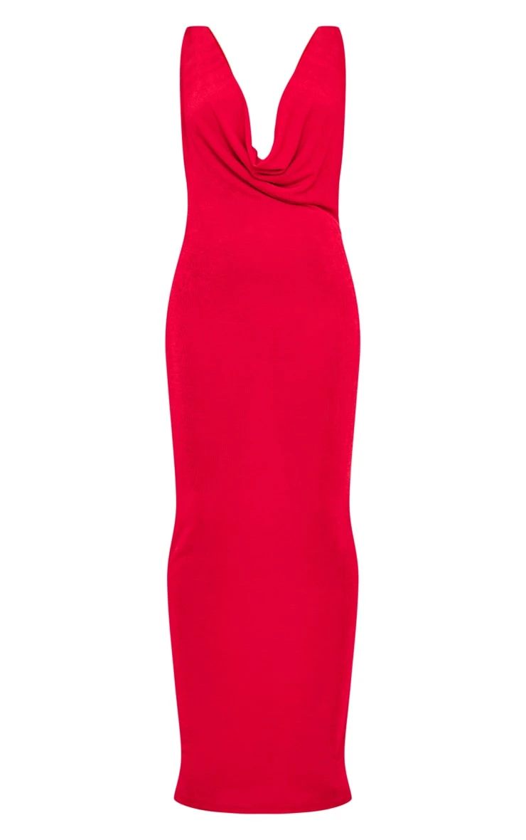 Turn up the heat on your new season wardrobe with this red acetate slinky extreme cowl maxi dress, you’re sure to have heads turning for all the right reasons in this statement piece. It is made with a red acetate slinky material with an extreme cowl neck design and a maxi length, how could you resist? Pair this dreamy maxi dress with your fave heels and simple accessories for a fierce finish.