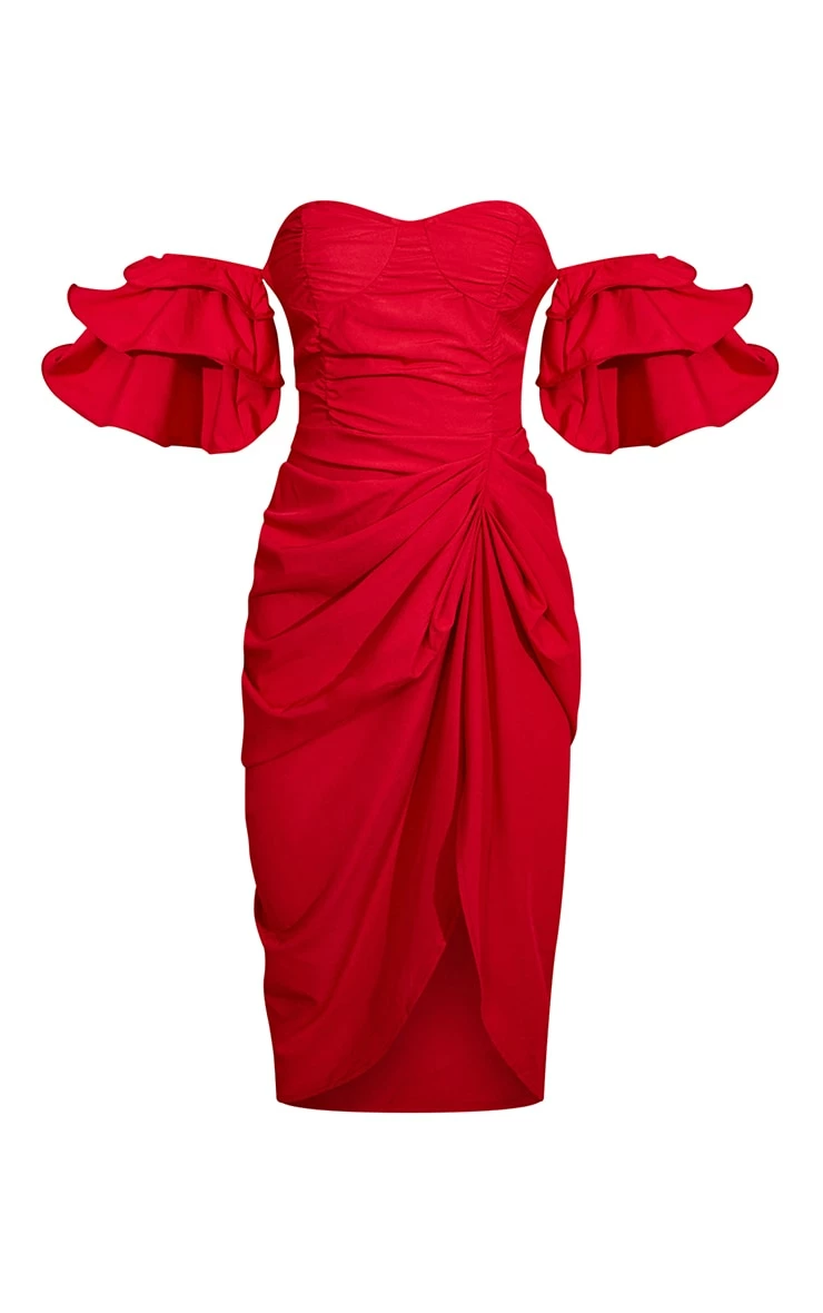 A red dress is a staple piece in every doll’s wardrobe and we are loving this one. Featuring a red material with a bardot neckline, frill detailing and a midi length, we’re obsessed. Team this with strappy heels and hoop earrings for a sassy look.