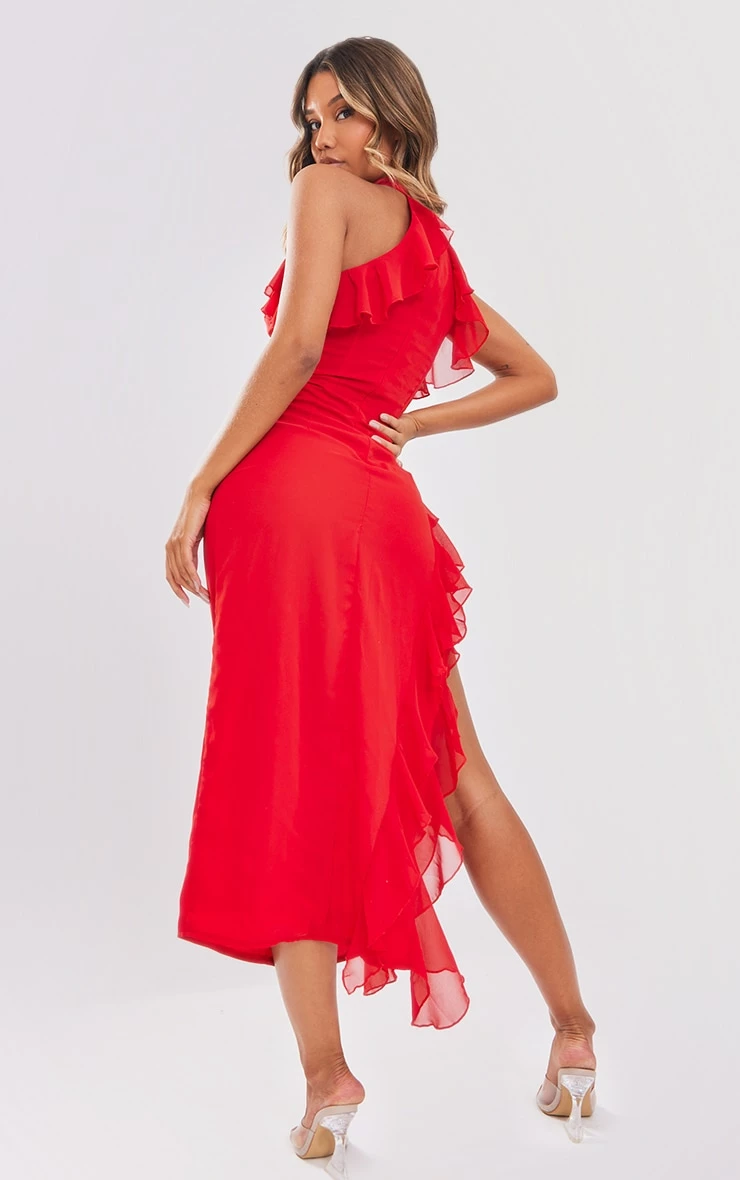 Take the stress out of weekend styling with this unreal red high neck drill split hem midaxi dress. Brought to you in a red material with a high neck, frill detailing and a split hem, you really can’t go wrong with this statement red dress doll. Style with clear strap heels and gold accessories for a look that will have eyes on you for all the right reasons.