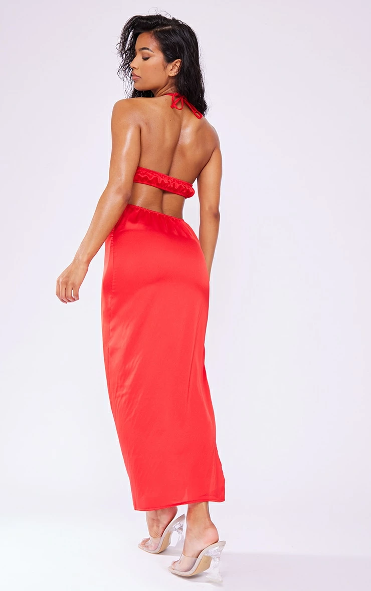 Got an occasion planned? Be sure to bring all the drama with this red satin strappy cut out midaxi dress. Made from a statement red hue satin material with a cut out design and a flattering midaxi length, how can you not fall in love? Style this midaxi dress with clear strap heels and some glam accessories for a look that will steal the stares for all the right reasons.