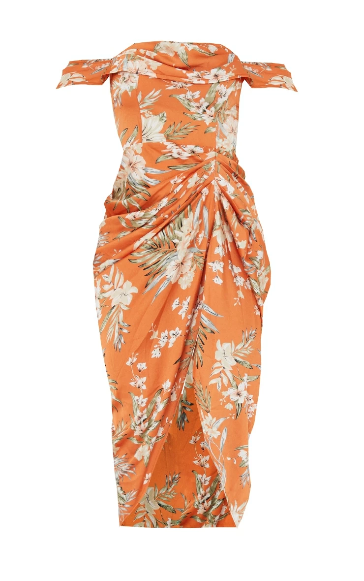 Get ready for your next big occasion with this midi dress. Featuring a rust satin material with a floral print, a draped design and a bardot neckline, team this dress with strappy heels for the ultimate feminine look.