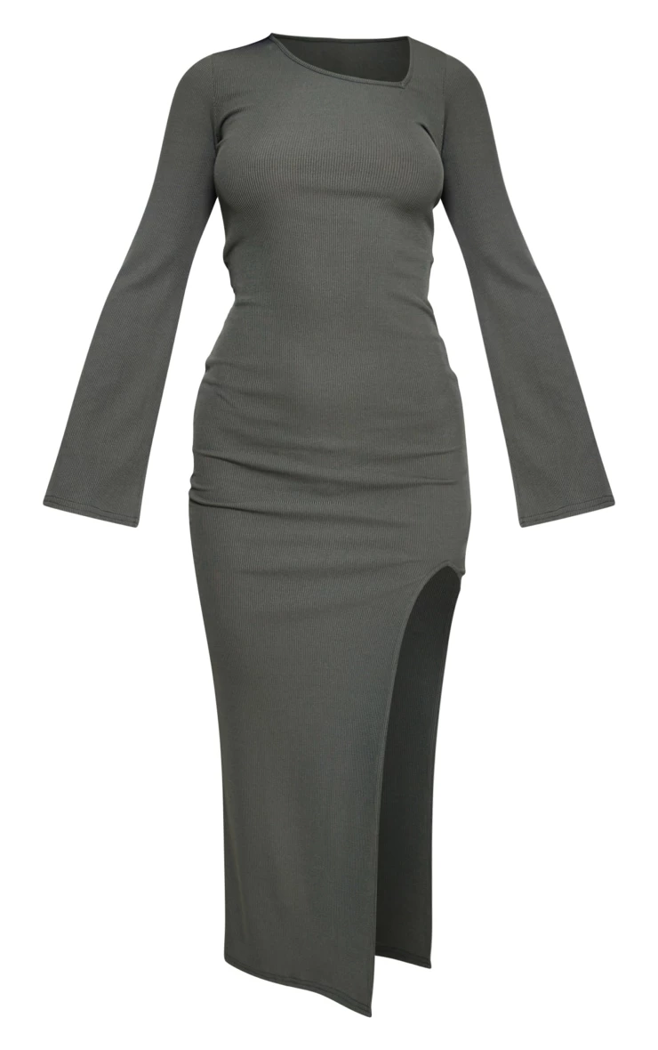 Take new season styling to a whole new level with this sage flare sleeve asymmetric rib split midi dress. It boasts a sage rib material with flared sleeves, an asymmetric design, a midi length and a figure-worshipping fit, what more could you ask for? It gets a yes from us. We are loving this paired with white sneakers, a shoulder bag and simple accessories for a minimalistic finish this season.