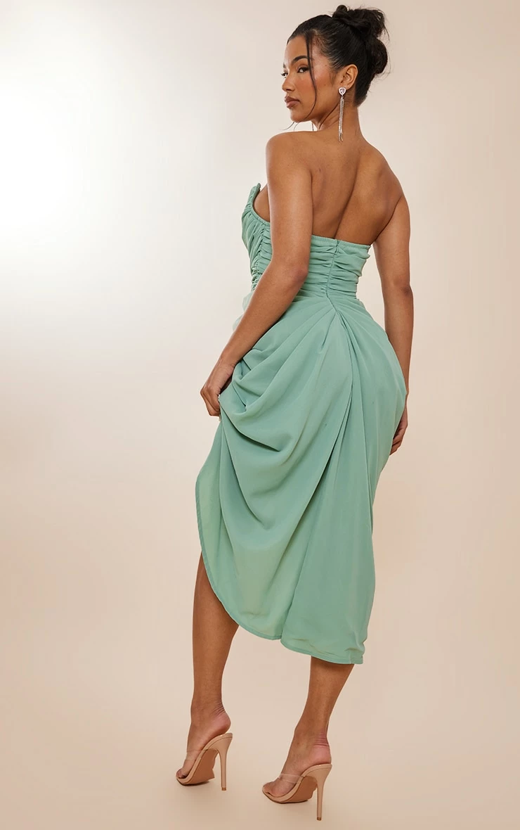 You are sure to make a statement in this sage green chiffon corset bandeau draped midi dress doll. We know you will fall in love. Made using a sage green hue chiffon material with a corset bandeau design and a flattering fit that will hug all the right places, what more could you ask for? We know you will earn all the likes. Simply style with high heels, gold hue accessories, a shoulder bag and walk with confidence for a head-turning combo.