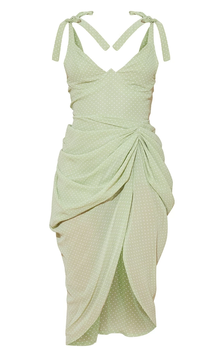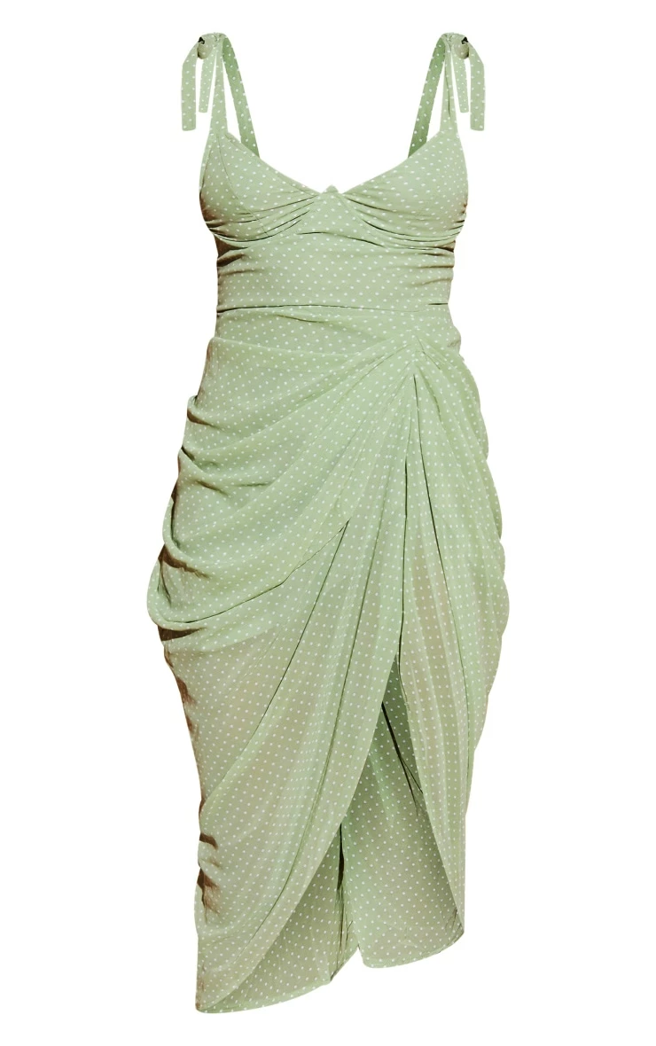 Got a special occasion coming up doll? Then this dress is a must-have. Featuring a sage green polka dot print material with a draped design and a midi length. Style with slip-on heels and minimal accessories for a look we’re loving.