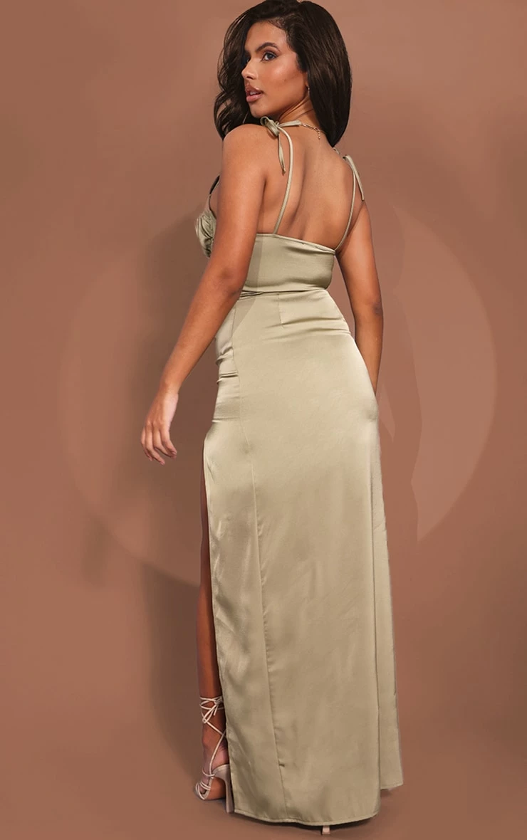 Your weekend outfit is finally sorted with this dress doll. Featuring a sage green satin material with a ruched cup design, tie strap detailing and a maxi length, what’s not to love? Team with your fave shoe-drobe pieces and statement accessories for a chic finish.