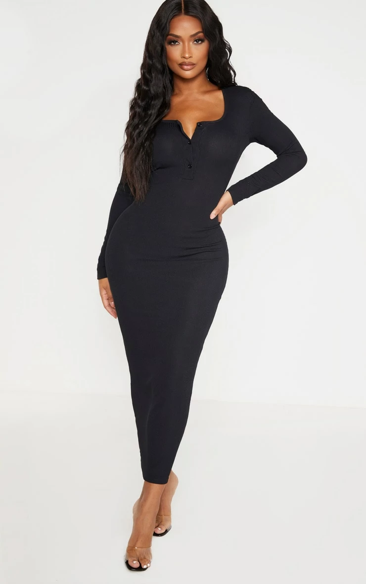 Show off your shape in this midaxi dress this season. Featuring a black rib material with long sleeves and a button up front design, wear with chunky clear heels and a chain necklace for a look we are loving.