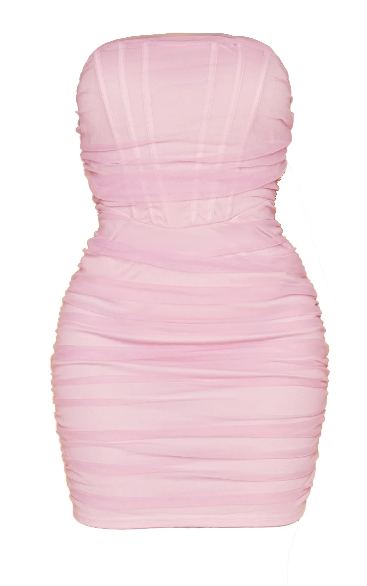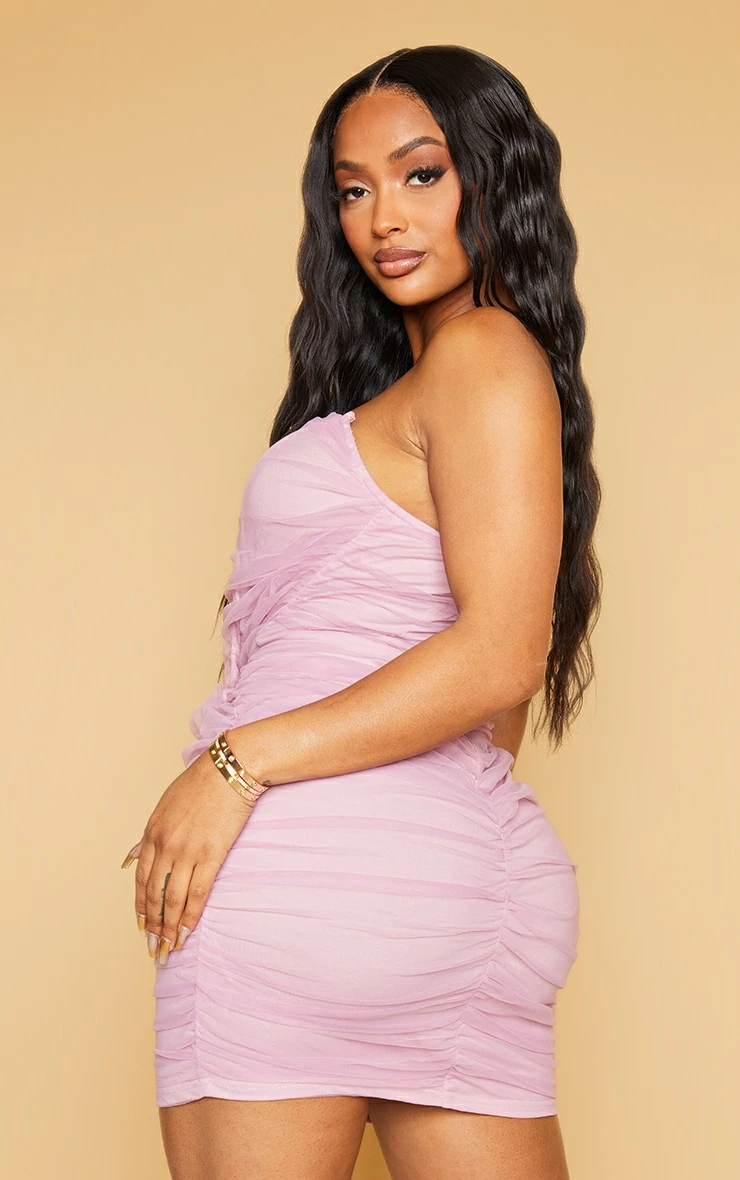 Give your look a fiercely feminine update with this dress. Featuring a mauve mesh material with ruched detailing and a figure-hugging fit. Style this with strappy heels and simple accessories to complete the look.