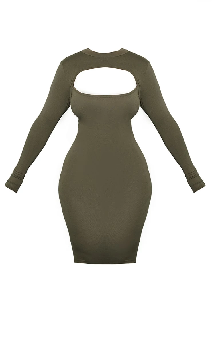 Be ready to feel your absolute best in this shape olive khaki jersey cut out long sleeve midi dress. Made from an olive khaki jersey material with a cut-out front, long sleeves and a mini length, how could you resist? This figure-hugging women’s dress is perfect teamed with clear high heels and a white mini bag for a glam finish.