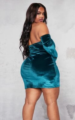 Plus Emerald Green One Shoulder Corset Ruched Satin Midi Dress