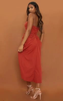 Rust Linen Look Bandeau Binding Detail Frayed Hem Bodycon Dress
