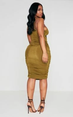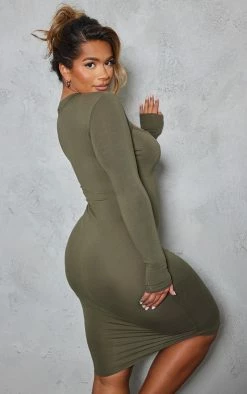 Shape Olive Khaki Cotton Notch Detail Long Sleeve Bodycon Dress