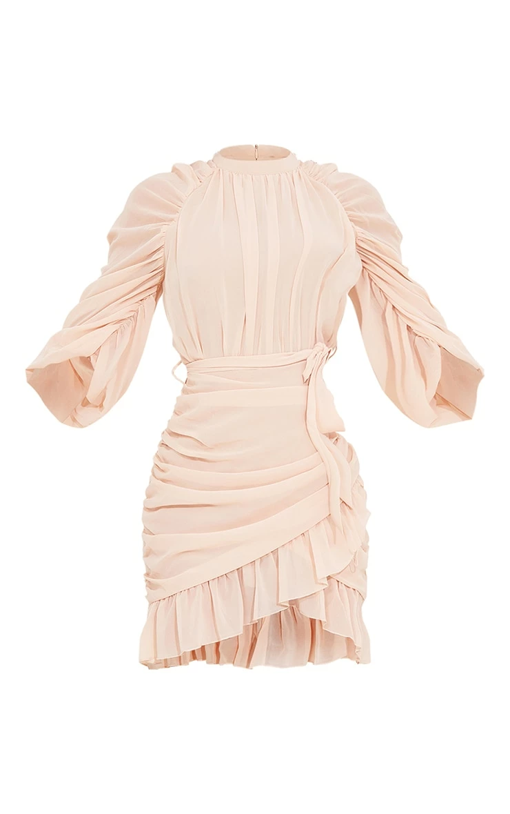 Add some chic, feminine feels to your weekend look with this dress. Featuring a stone chiffon material with ruched sleeve detailing and a frill hem design. Wear this with clear heels and a mini bag to get the look.