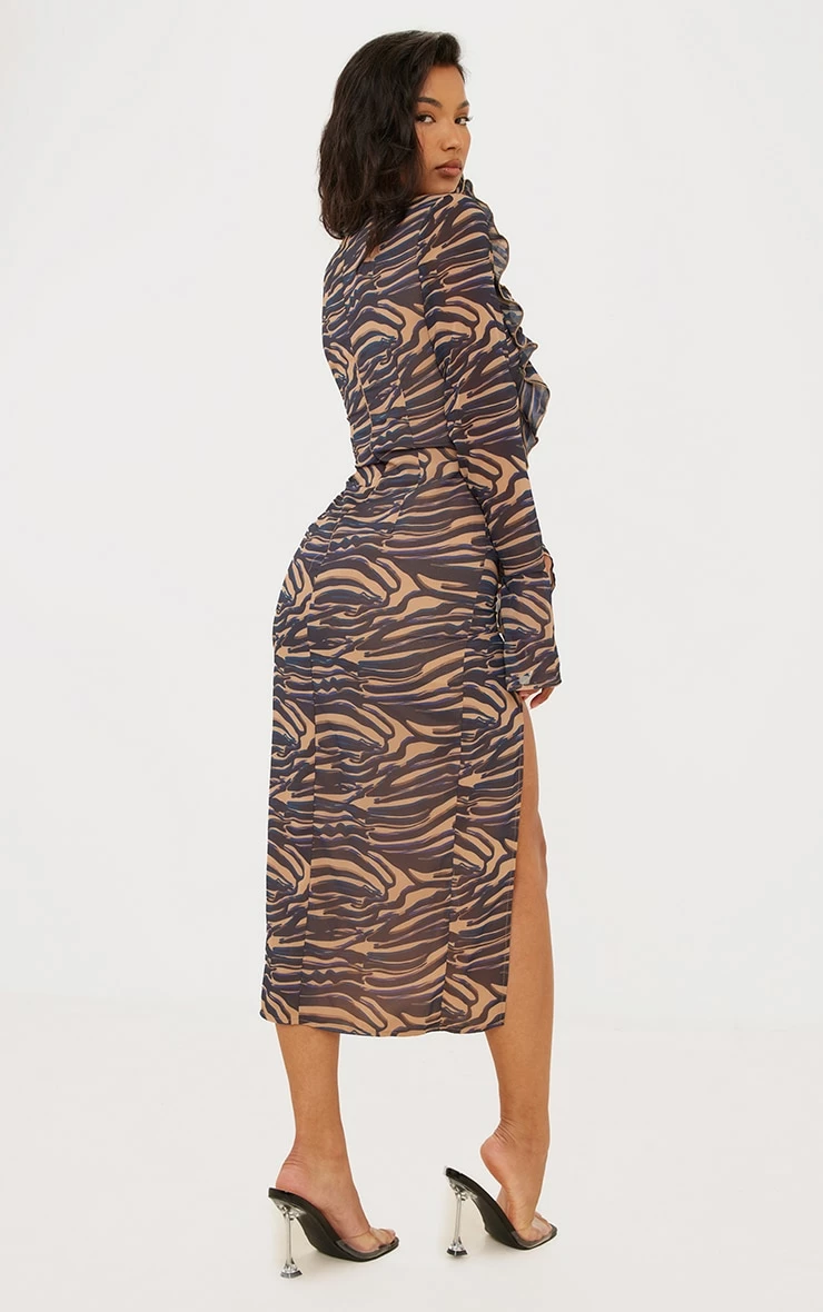 Up your style game with this stone zebra print chiffon frill detail midi dress. This dress is made from a stone hue with a zebra print design that will have you standing out from the rest. With a midi length and a frill detail, you are sure to stand out from the rest. Team with some clear heels and your fave accessories to complete the look we are loving.