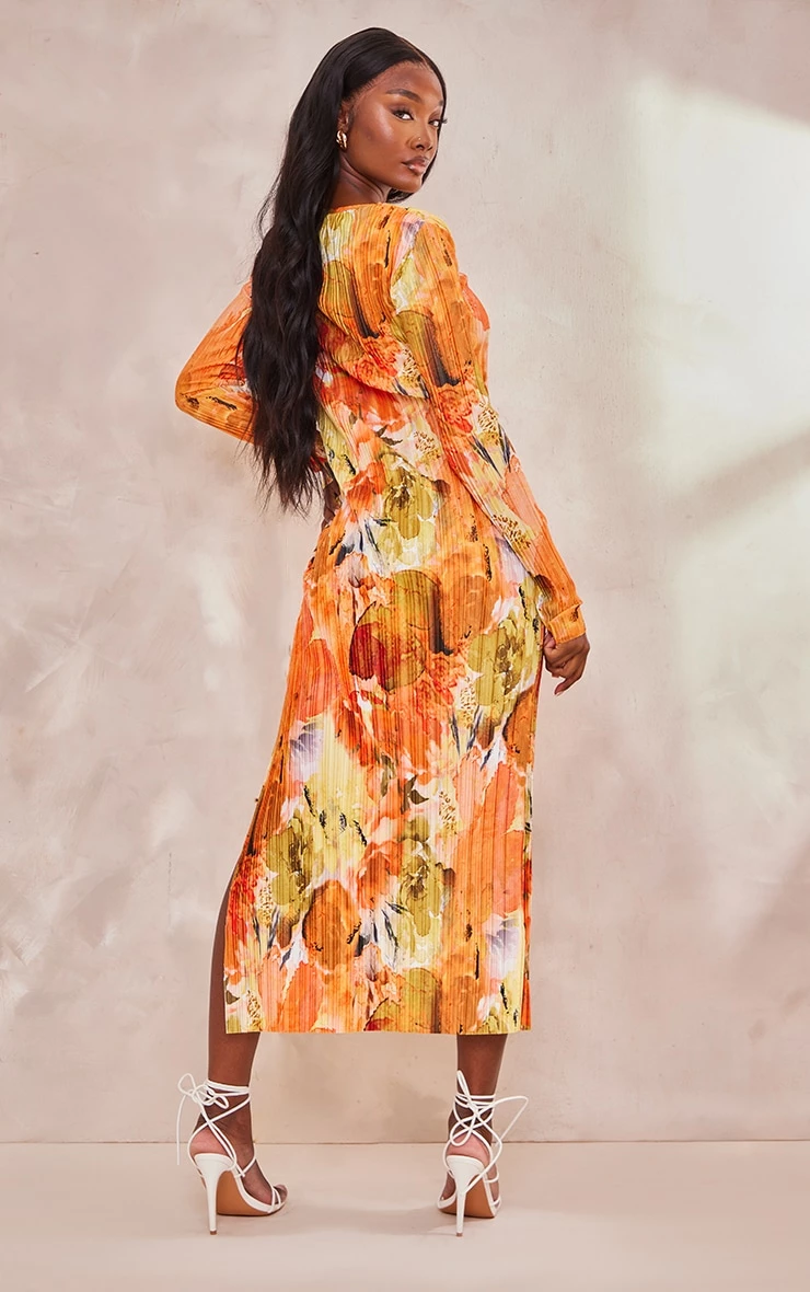 Inject some bold floral prints into your occasion look with this tall orange floral print plisse long sleeve split detail midi dress. This statement dress is sure to make you stand out from the crowd doll. Brought to you in an orange hue plisse material with a floral print design, long sleeves , split detail and a midi length, how can you resist? Just add strappy heels and an oversized clutch to bring the look together.