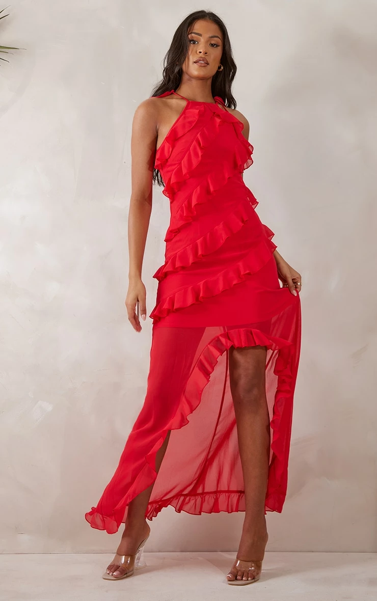 Get your glam on with this tall red strappy frilled maxi dress. Brought to you in a red material with a strappy design, frilled detailing and a maxi length, how could you say no? This dress will have heads turn wherever you step foot doll. Pair this with your trusty high heels and gold accessories to secure the look..