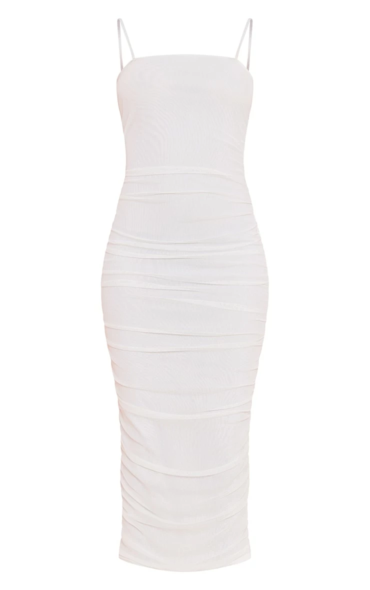 Stay on your A game this weekend with this must-have piece. Featuring a white mesh material with a ruched detail, midi length and flattering fit we are obsessed. Just add some slip on heels and gold accessories for a vibe like no other.