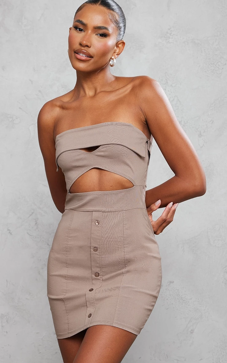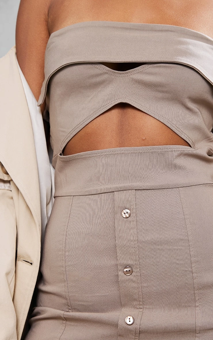 This season a taupe bandeau cut out button down bodycon dress is essential and we are loving this style. This dress is brought to you in a taupe hue that is sure to amp up your neutral collection doll. With a bandeau design and a cut out detail, what more could you want? Style with some gold hoops and a pair of white sneakers to finish off this effortlessly chic look.
