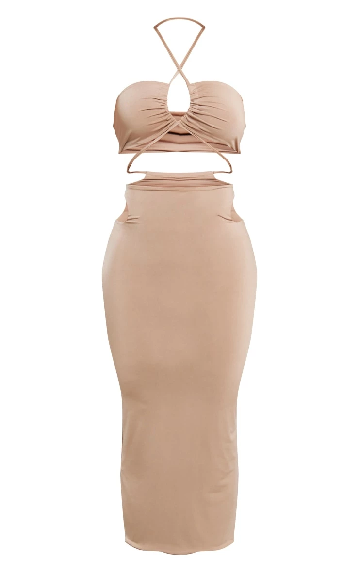 Your weekend outfit is finally sorted with this taupe slinky multi cut out cross neck midaxi dress. This unreal dress is brought to you in a taupe slinky material and a and a cut out design that will have you feeling confident all season long. With a cross-neck design, this midaxi dress is perfect for those plans with the dolls. Team with some clear heels and your fave accessories to complete this effortlessly chic look.