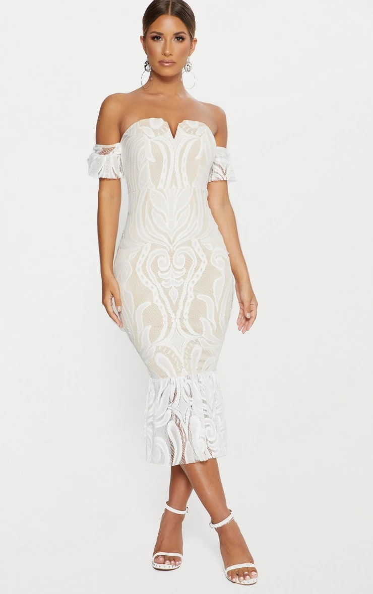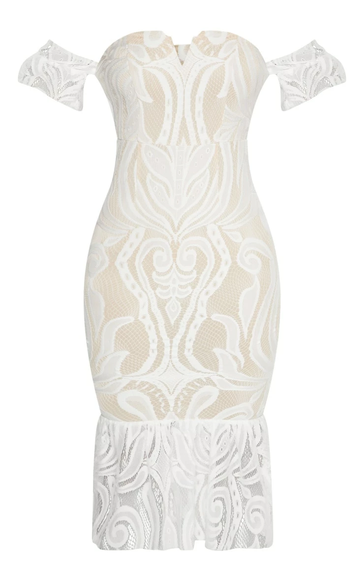 Featuring a lined white lace fabric, a bardot neckline with short sleeves and a frill hemline, this midi dress is perfect for any upcoming occasions. Team it with some strappy heels and statement earrings for the perfect party look.