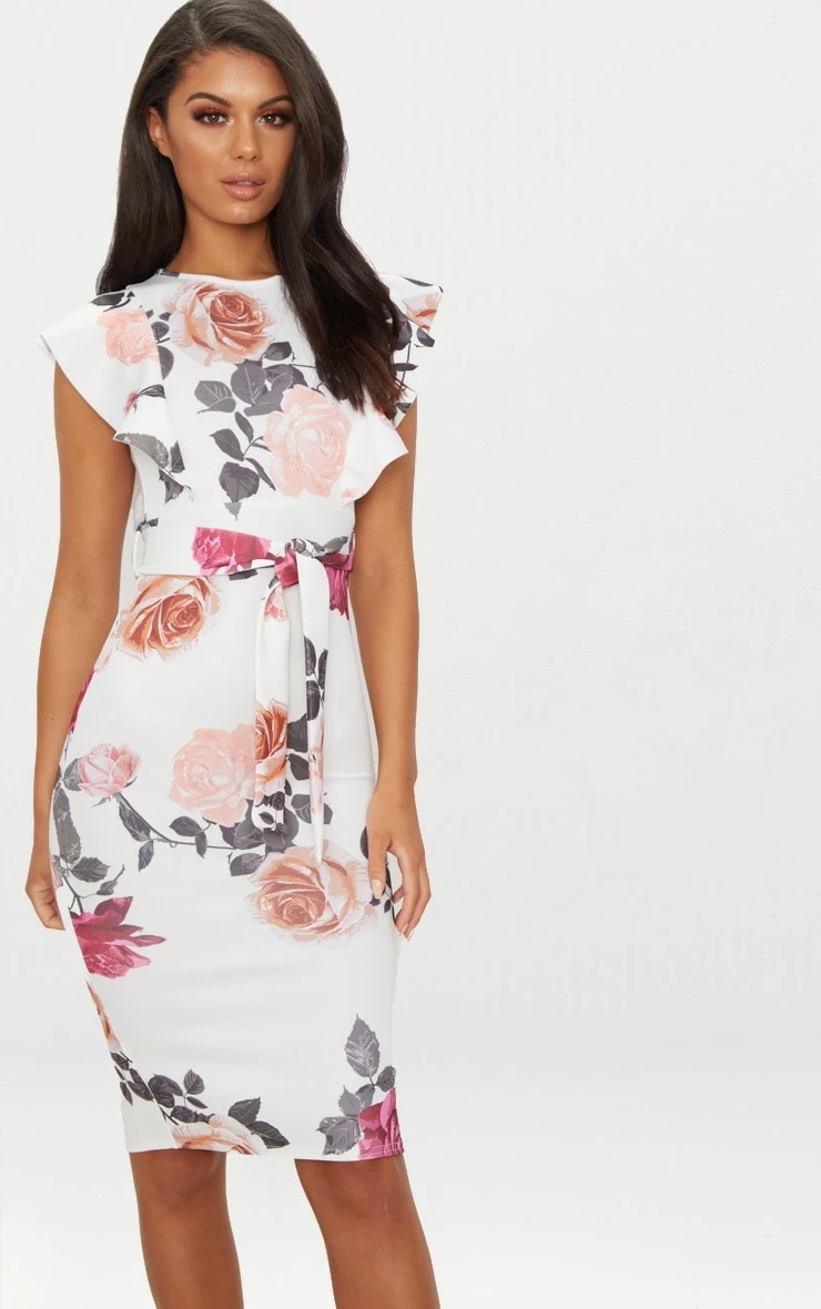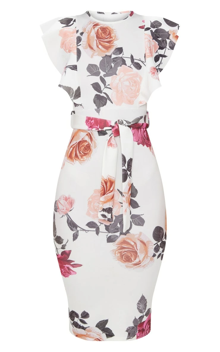 This figure-flatting dress occasion dress is essential for that special day. Featuring a white stretchy material with a floral print design, frill sleeves and a tie waistline in a midi style. Look very feminine in this dress with nude strappy heels girl.