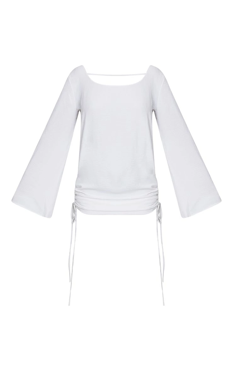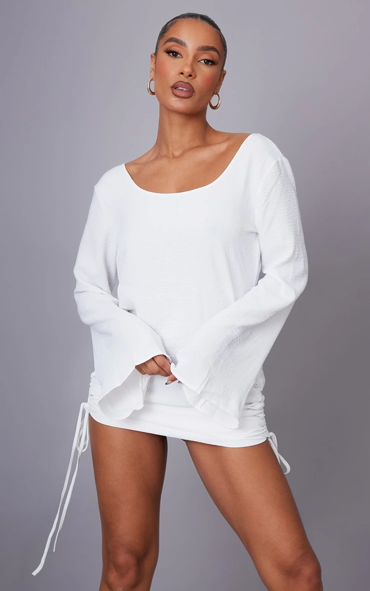 Nail new seasons trends with this white texture satin ruched side backless bodycon dress. Made from a white textured satin material with ruched side detailing, a backless design and a figure-skimming fit, what’s not to love? Pair this dreamy dress with black high heeled boots and your glam accessories for a look like no other.